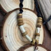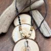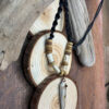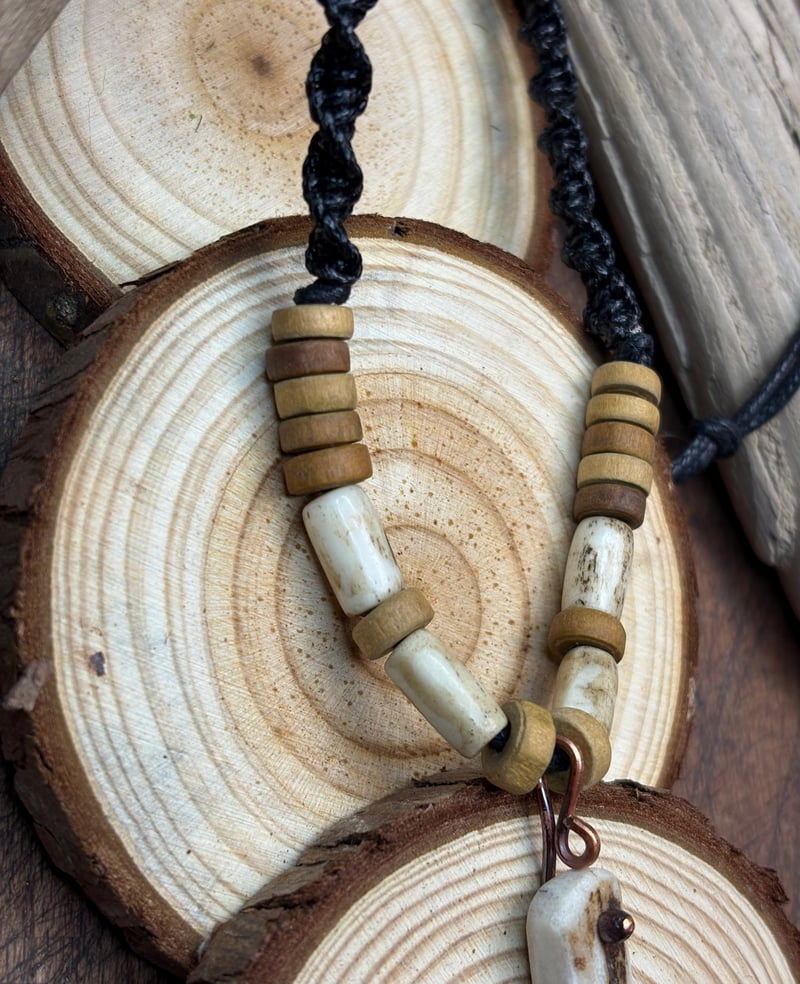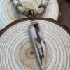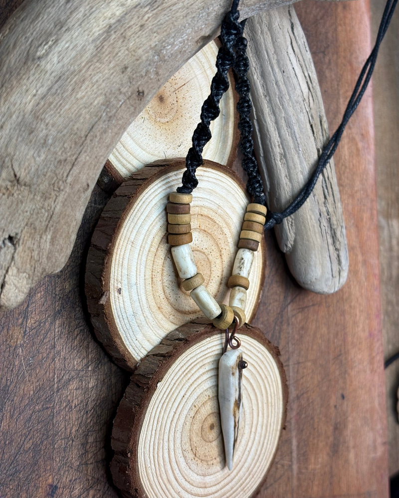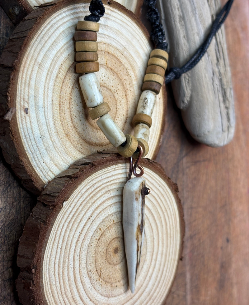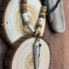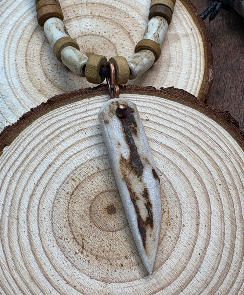 Amulet z kła wykonany z poroża jelenia Daniela z dodatkami wałków również wyrzeźbionych z poroża.