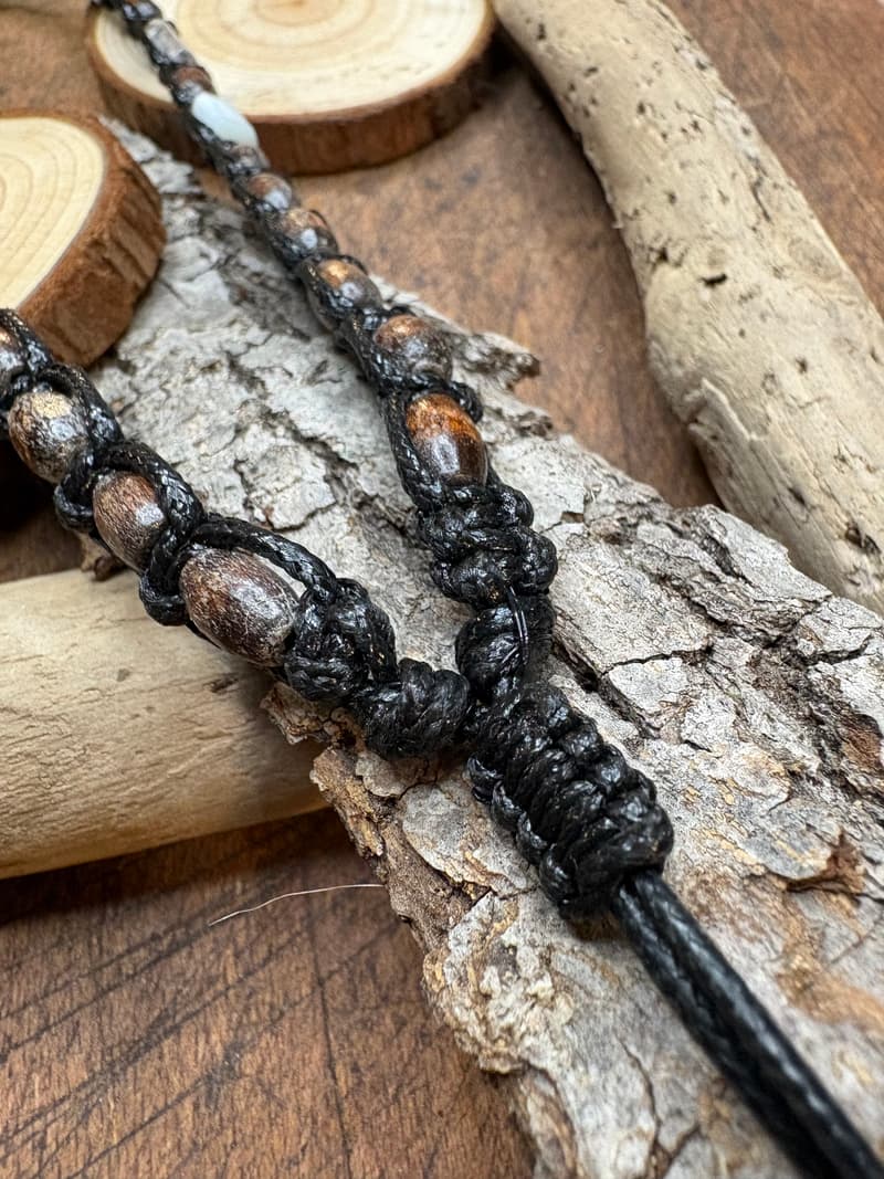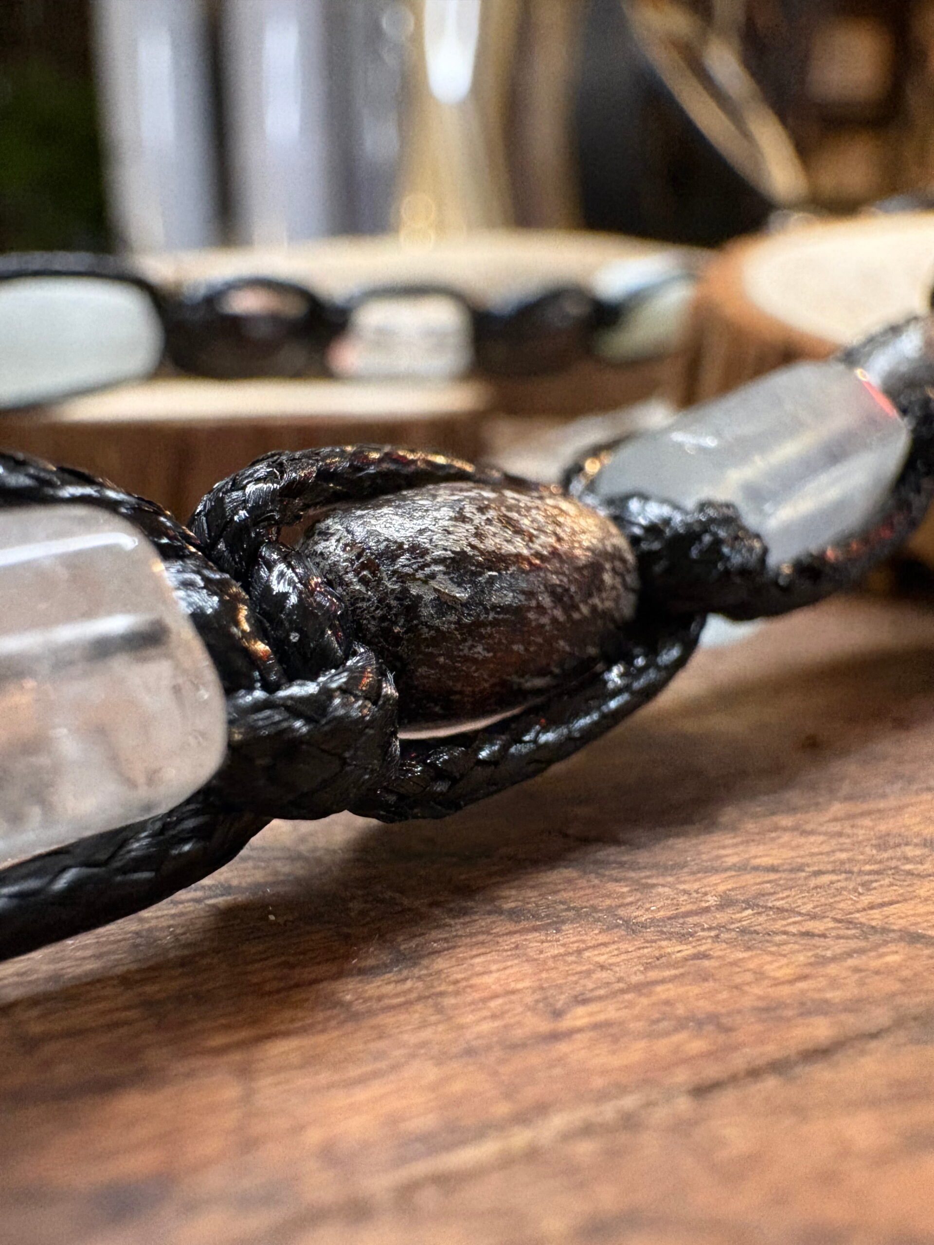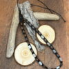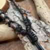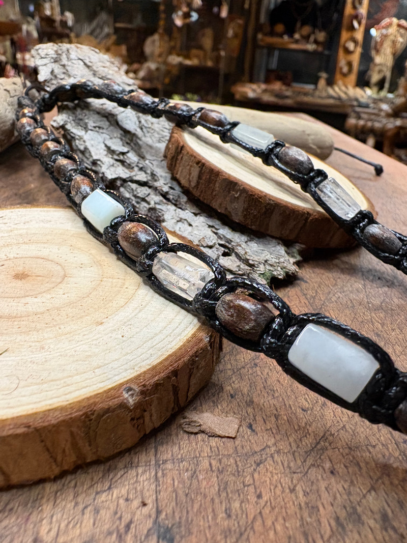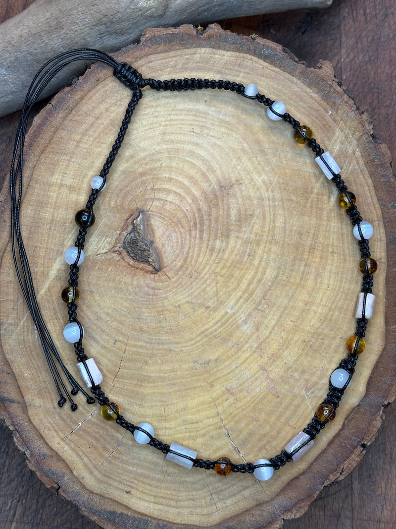 Naszyjnik wykonany ręcznie techniką makramy, na czarnym, wytrzymałym sznurku woskowanym jubilerskim. Ozdobiony naturalnymi minerałami AkwamarynemKryształem górskim.