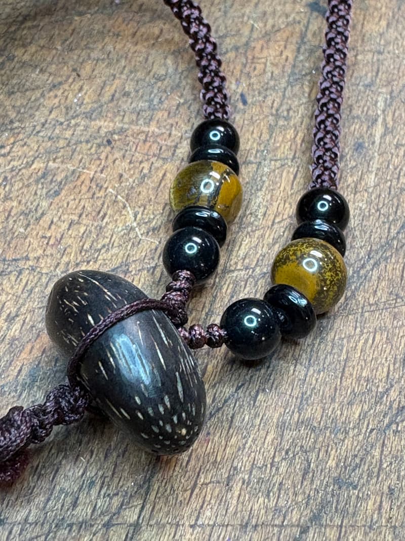 Nad nim osadziłam łuskę orzecha, która stanowi organiczny łącznik między zawieszką a kompozycją koralików.