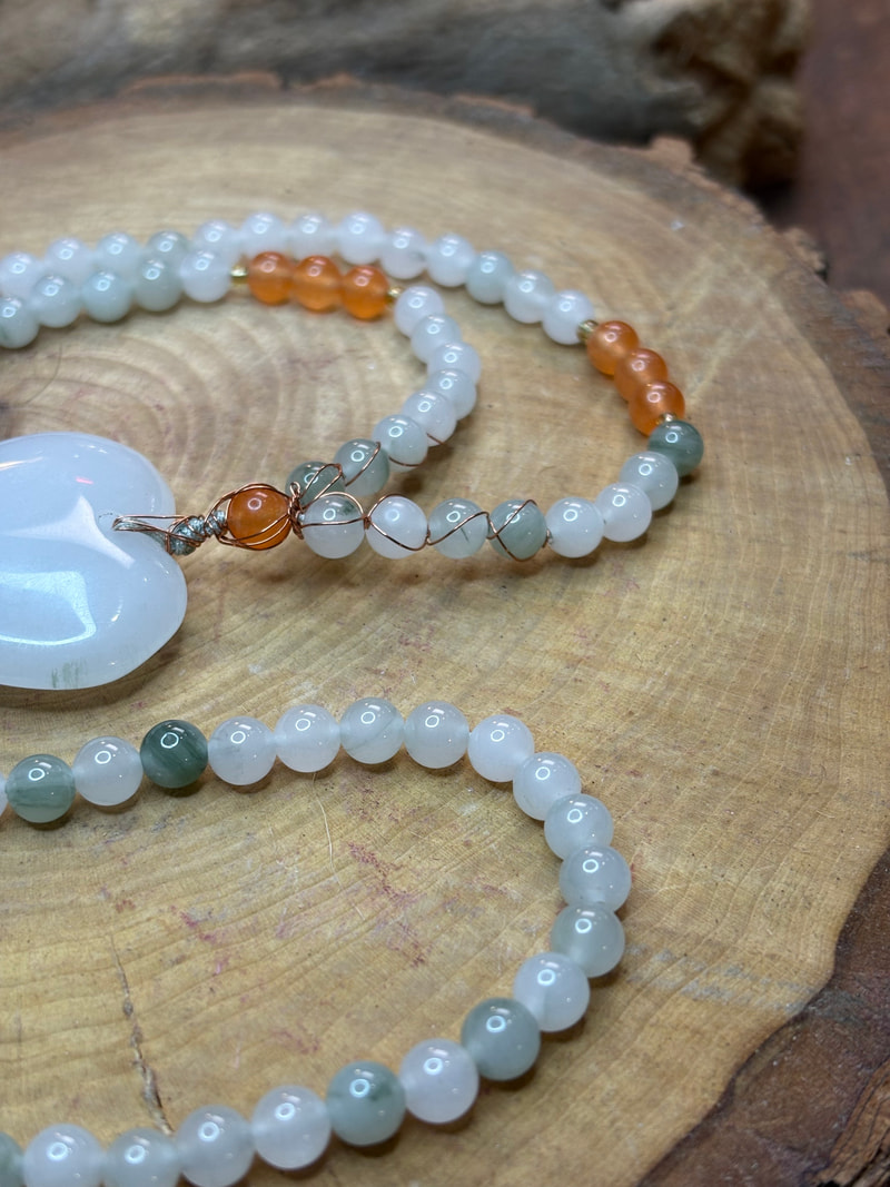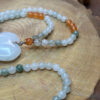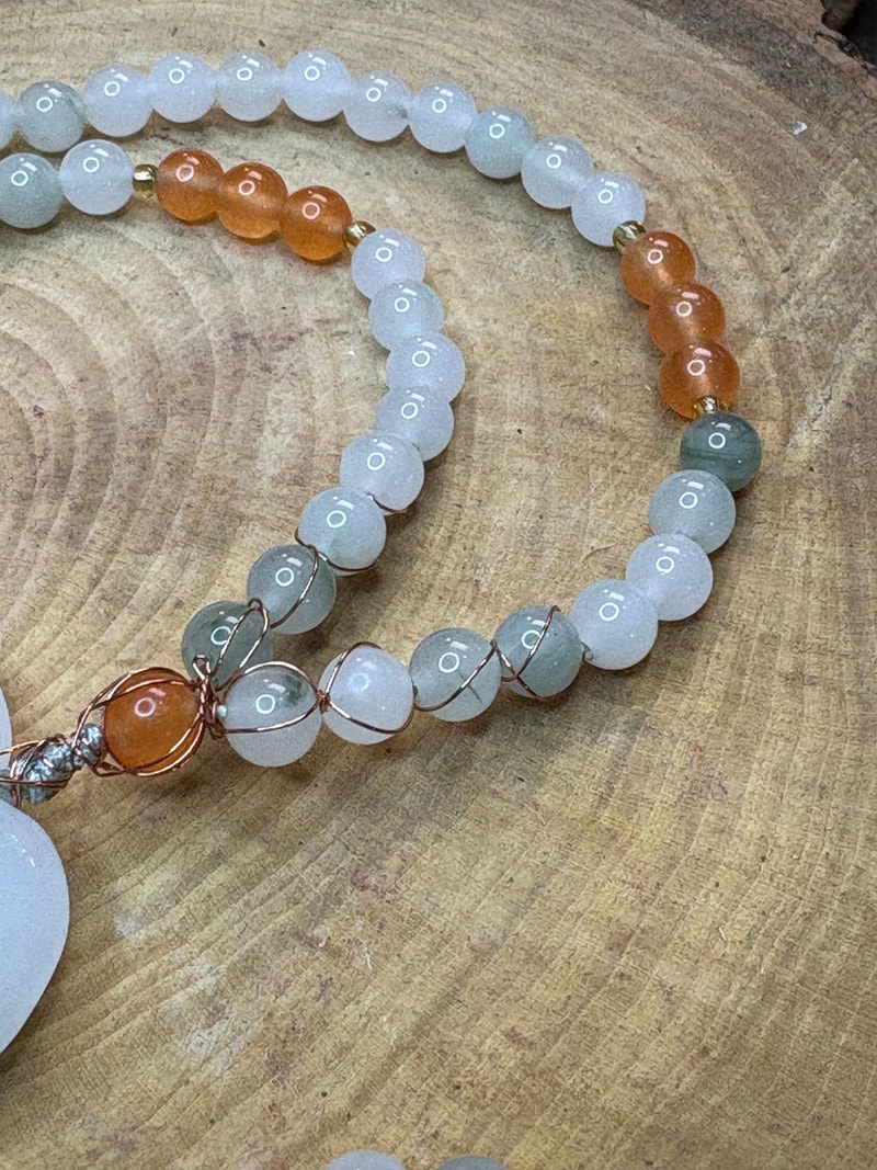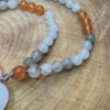 Po całym obwodzie wykonany z minerału Fluoryt i Karneol, które przełamują chłodną, mleczną biel delikatnymi odcieniami zieleni i ciepłej pomarańczy.