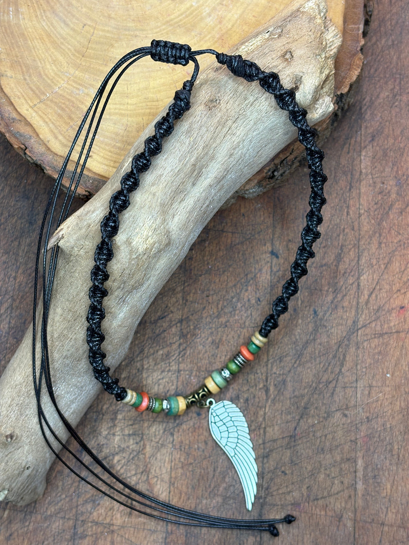 Akcenty z drutu miedzianego oraz drobnych szklanych kuleczek spinają talizman w sposób prosty i naturalny, bez nadmiaru.
