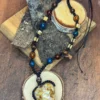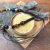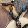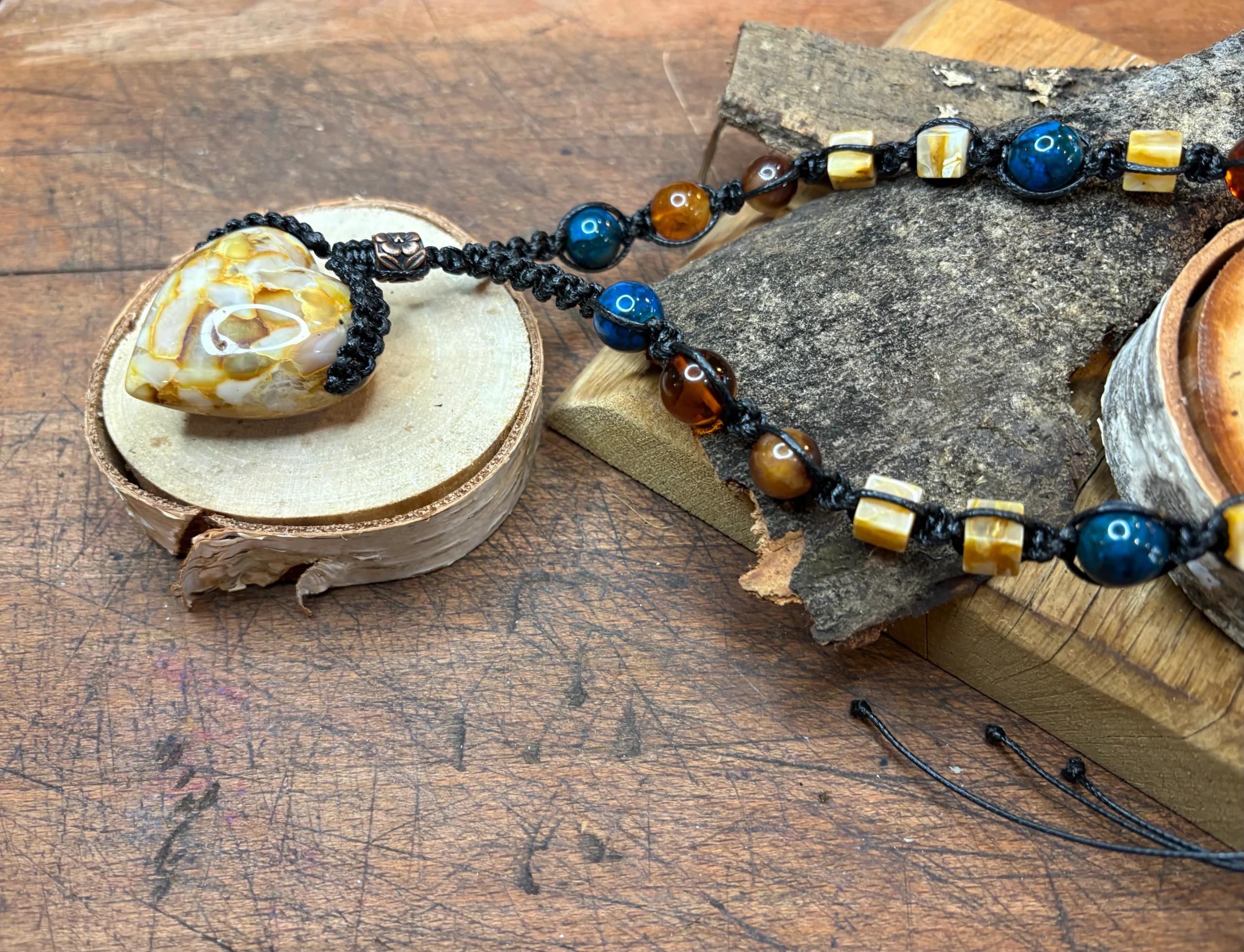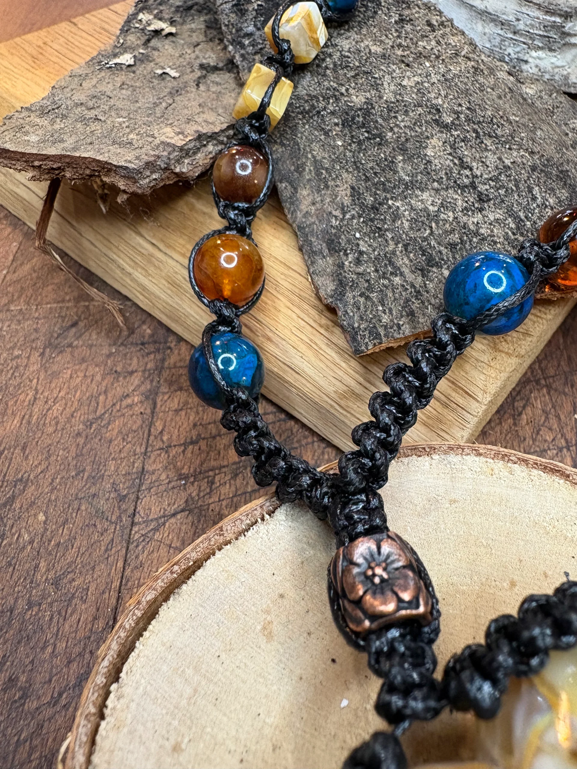 Całość splotłam ręcznie na czarnym sznurku, prostym i mocnym splotem, który podkreśla naturalność minerałów. Subtelny, kwiatowy akcent z miedzi domyka kompozycję, wprowadzając delikatny, etniczny detal.