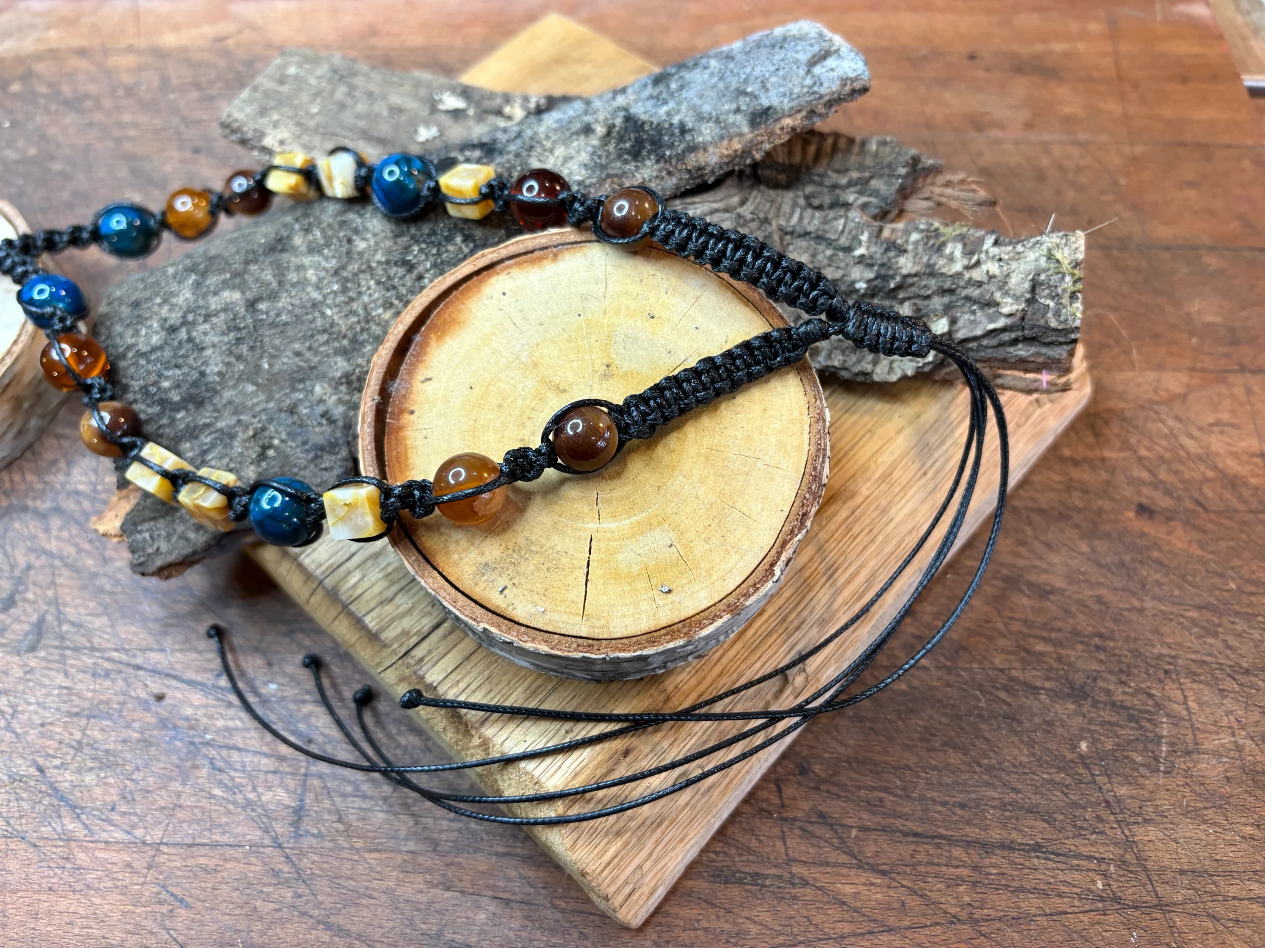 Wyrób w całości wykonany ręcznie. Regulację zastosowałam w formie przesuwaka makramowego.
