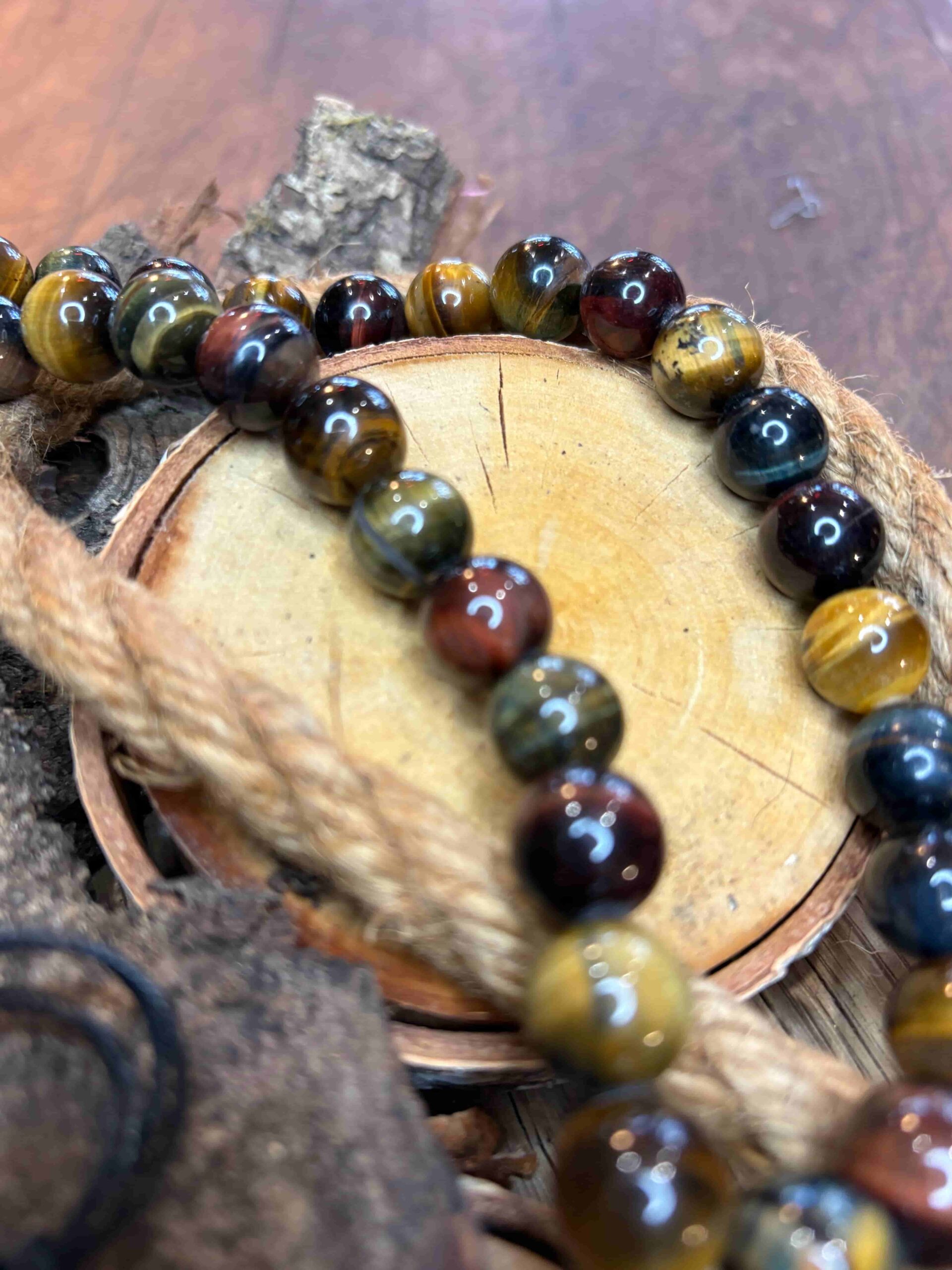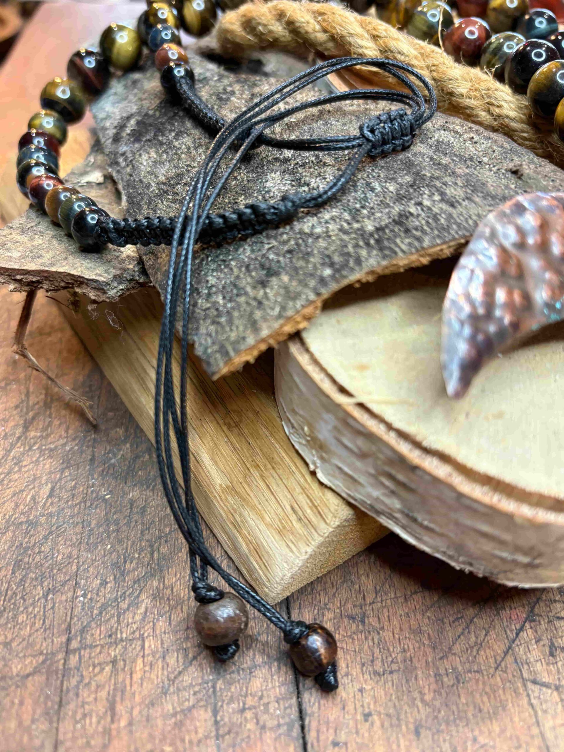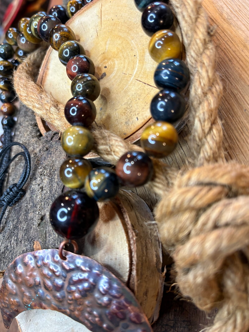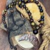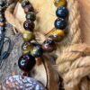 Złoto, głęboki brąz i mocny granat tworzą kamienny krąg ochrony, odwagi i jasnego spojrzenia.