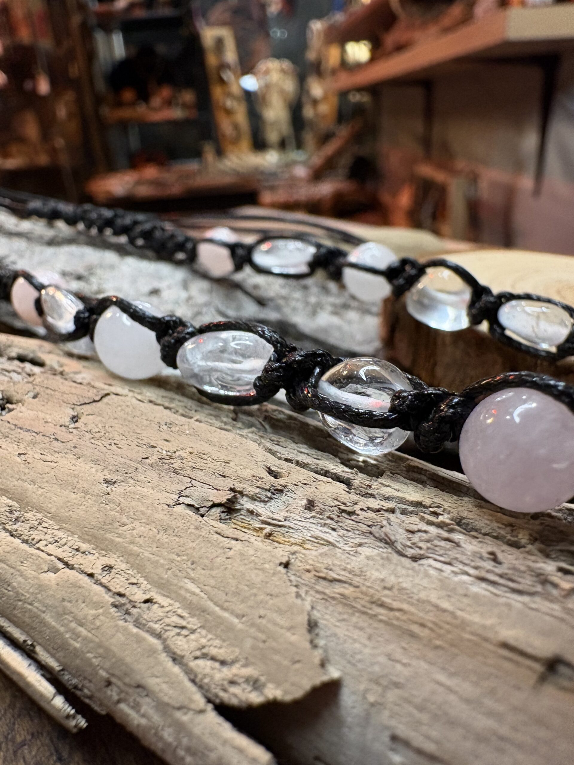 Na ramionach wplotłam kryształ górski, kwarc mleczny i kunzyt. Każdy z nich niesie inną opowieść. Kryształ górski, oczyszcza i wzmacnia to, co w Tobie prawdziwe. Kwarc mleczny, otula łagodnością i spokojem. Kunzyt, otwiera serce, prowadzi w stronę czułości i delikatnej odwagi.